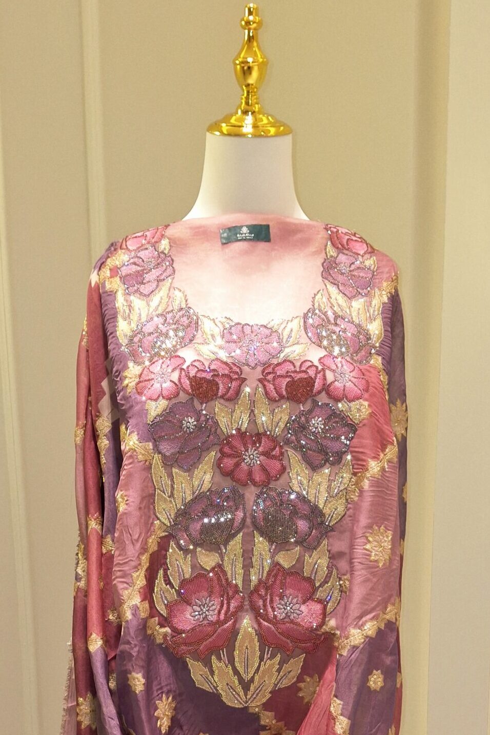 مطرزة يدويًا بتفاصيل بارزة من الخرز والترتر بتدرجات بنفسجية ووردية وذهبية، على شكل ورود أنيقة بتصميم ثلاثي الأبعاد يزين فتحة الصدر بأسلوب فاخر ولافت