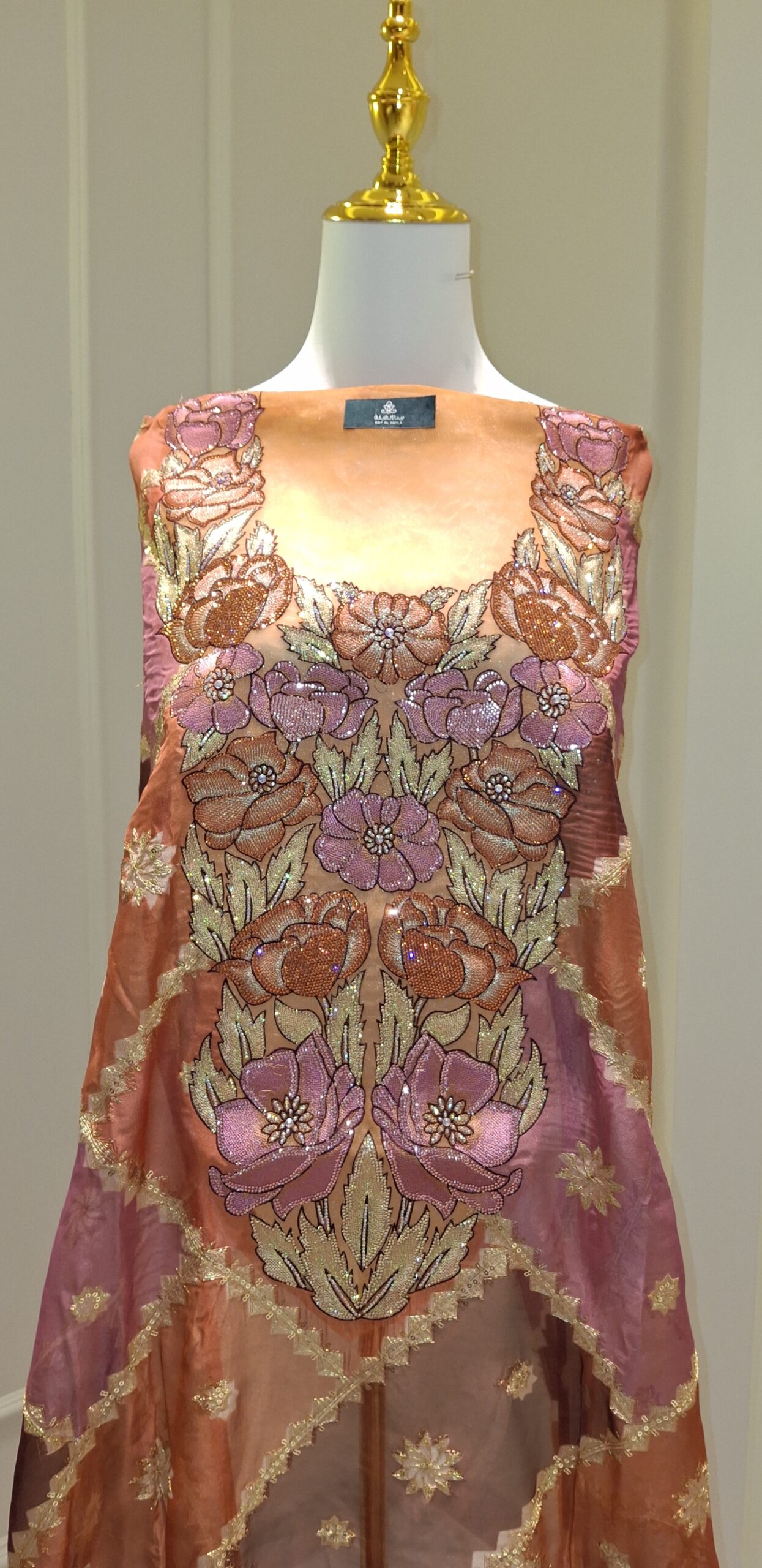 مطرزة يدويًا بتفاصيل بارزة من الخرز والترتر بتدرجات وردية، برتقالية وذهبية، بنقوش ورد ثلاثية الأبعاد تمتد على فتحة الصدر وتزين الأطراف بأسلوب فخم يخطف الأنظار