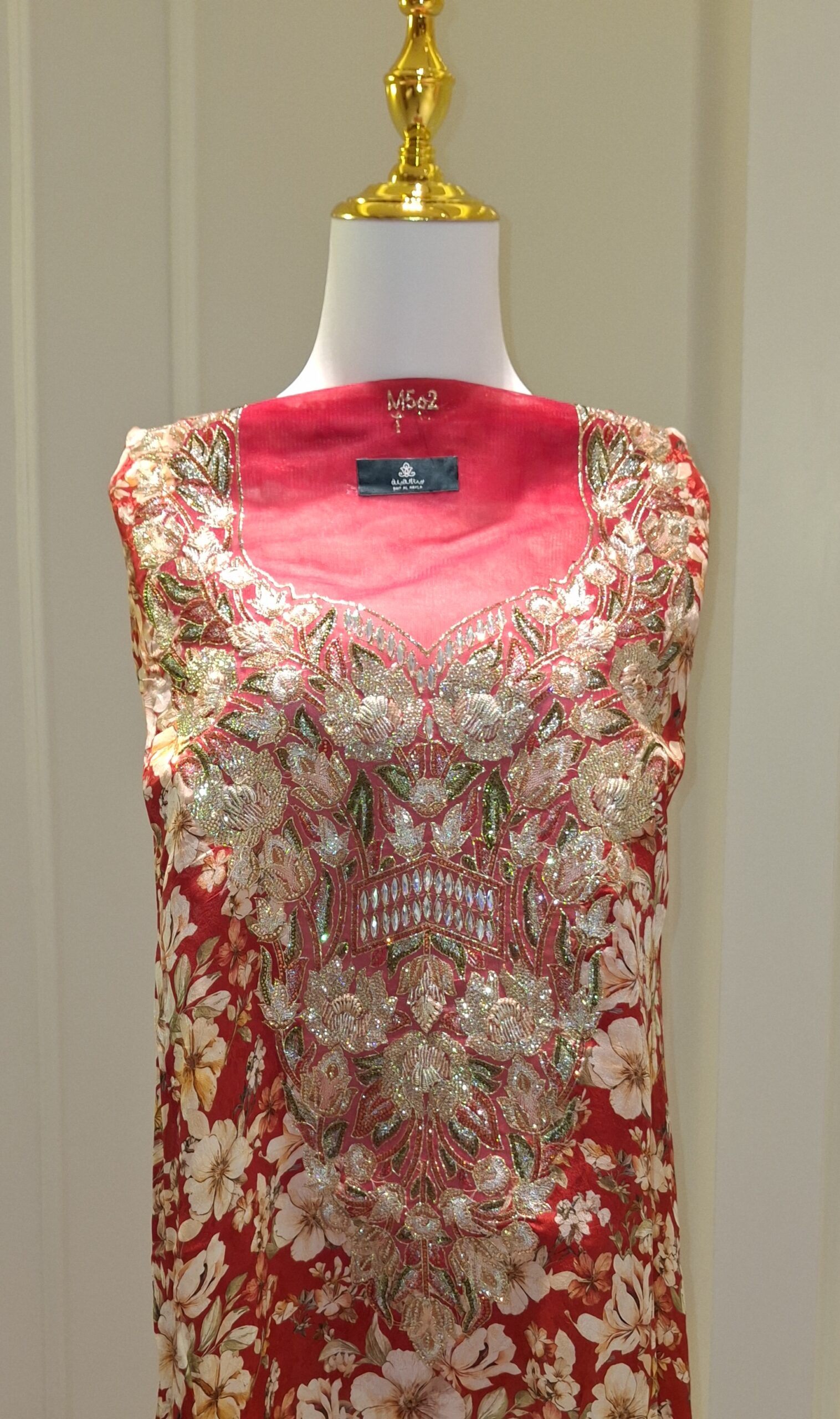مزينة بتطريز يدوي فاخر بتفاصيل دقيقة من الخرز والترتر والشك البراق، تضيف لمسة ملكية إلى فتحة الصدر بأسلوب ثلاثي الأبعاد يخطف الأنظار