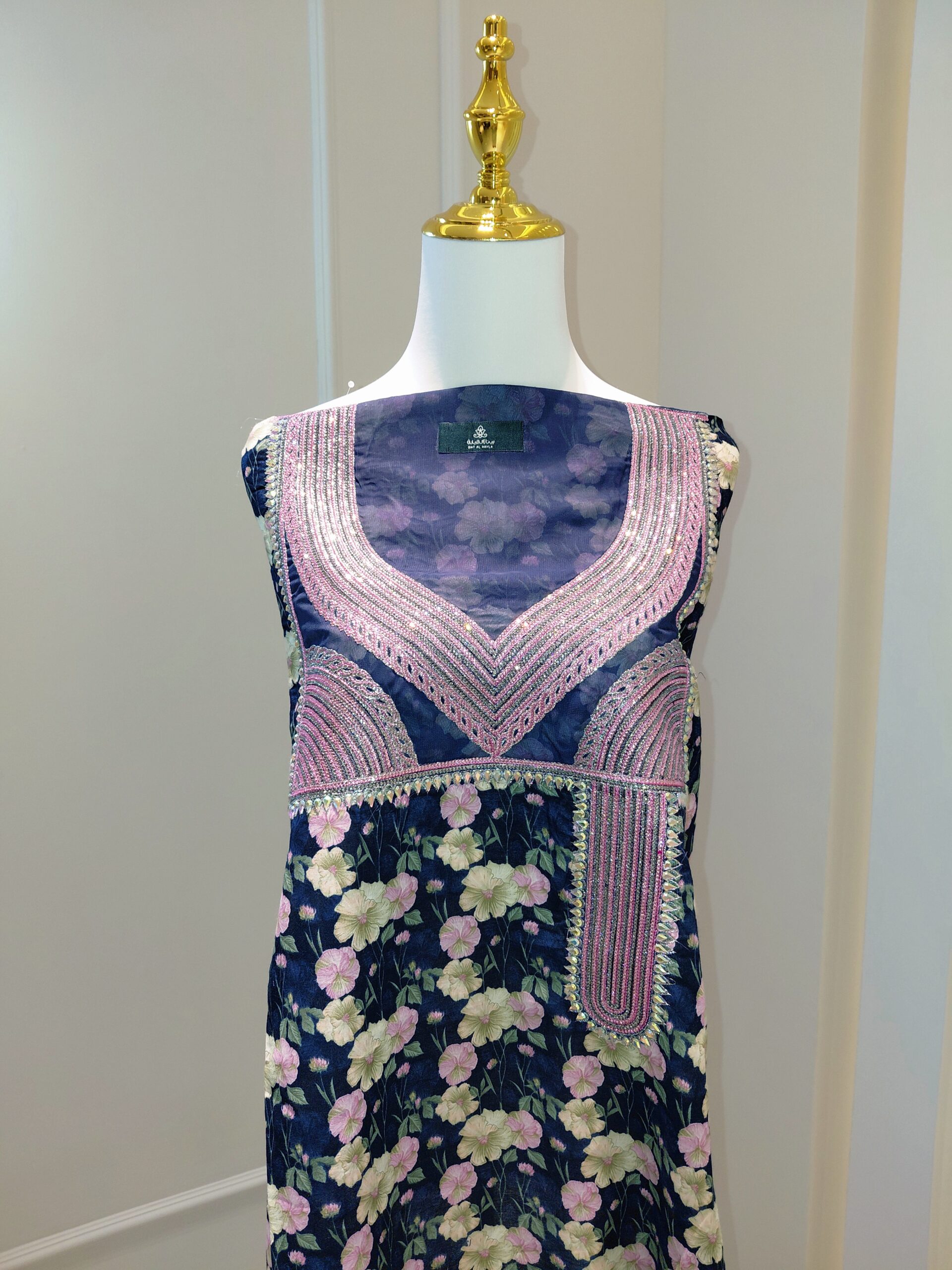تطريز بارز باللون الوردي يزين فتحة الصدر بتصميم هندسي عصري، يمنحها لمسة مميزة دون مبالغة، لتناسب أجواء البيت والجلسات اليومية.