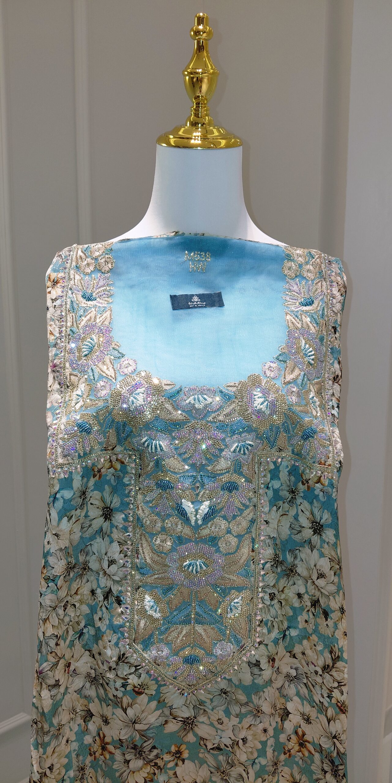 تصميم الصدر مزخرف يدويًا بخيوط حريرية وخرز لامع وترتر متلألئ يبرز جمال القماش ولمعته، ويمنحك حضور فخم في أي مناسبة.