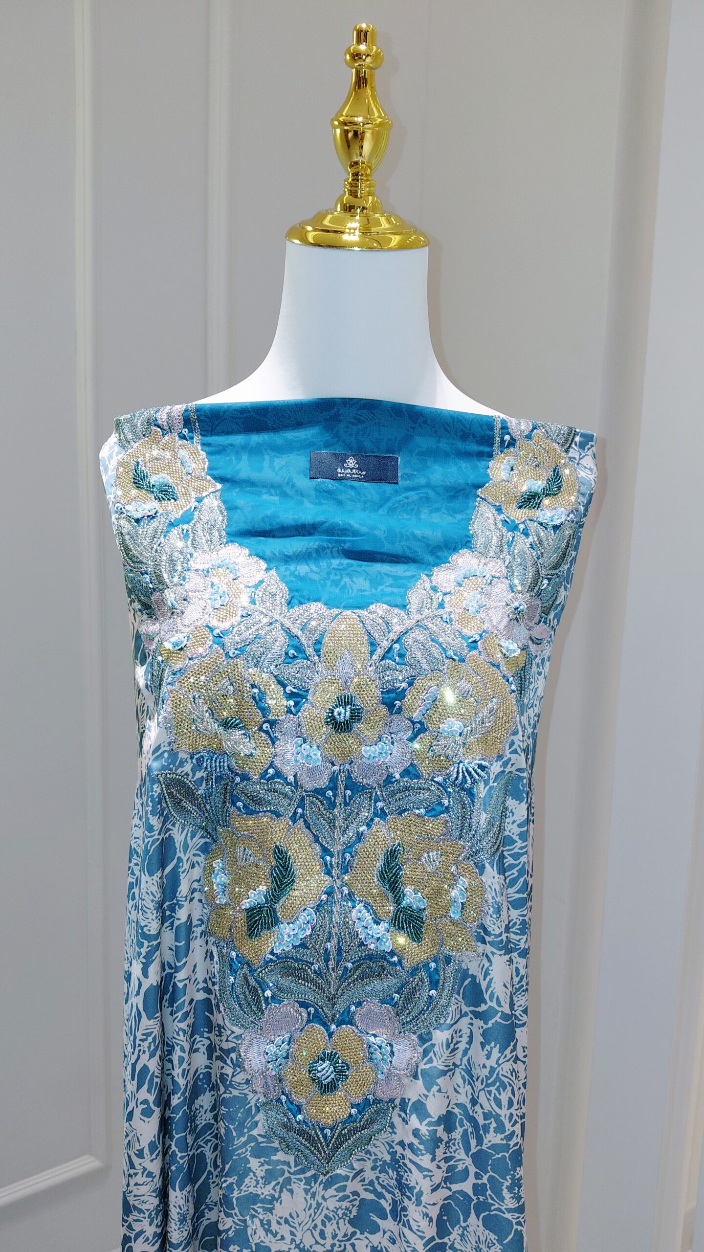 تطريز يدوي فخم يزيّن منطقة الصدر بتفاصيل أنثوية راقية باستخدام الخرز والترتر بدرجات الأخضر والذهبي